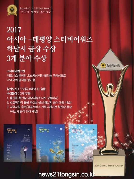 하남시는 2017 아시아-태평양 스티비어워즈(Asia–Pacific Stevie Awards) 3개 분야에서 금·은·동상을 수상했다고 25일 밝혔다.