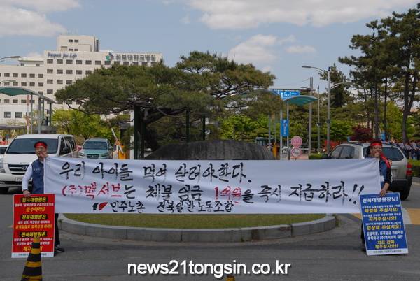 오늘 4월27일 오후12시경 전북대학병원 민주노총 전북일반노동조합은 시설관리 노동자들의 체불임금 1억을지급하라고 하였다.