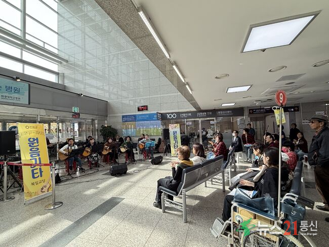원광대학교병원(병원장 서일영)은 지난 30일(목) 외래 1관 1층 로비에서는 힘들고 무료한 병상 생활에 지친 환우들의 고단한 마음을 위로해 주고 밝은 웃음을 함께 나눌 수 있는 아름다운 선율이 흐른 작은 음악회가 열렸다. 이번 작은 음악회에는 익산의 통기타 동호회 “기타 하모니(회장 박찬용), 원음기타(회장 조형정)” 회원 20여 ...