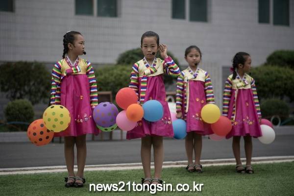 북한 어린이들이 평양에서 '어린이 날'을 기념하는 활동의 일환으로 춤 공연을 준비하고 있다.
