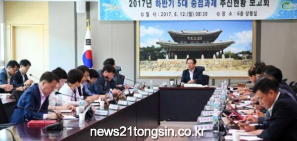 광주시는 12일 상황실에서 조억동 시장 주재로 국·소장, 담당관, 읍면동장 등 60여명이 참석한 가운데 “2017년 하반기 5대 중점과제 추진현황 보고회”를 개최했다.