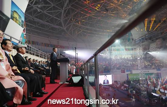 또한 개막식에 함께한 북한의 장웅 국제올림픽위원회(IOC) 위원과 국제태권도연맹(ITF) 소속 북한 태권도 시범단을 향해 “진심 어린 환영의 말씀을 드린다”며 “태권도에서 이뤄낸 이번 성과가 내년 평창동계올림픽으로 이어지기를 기대한다”고 말했다.