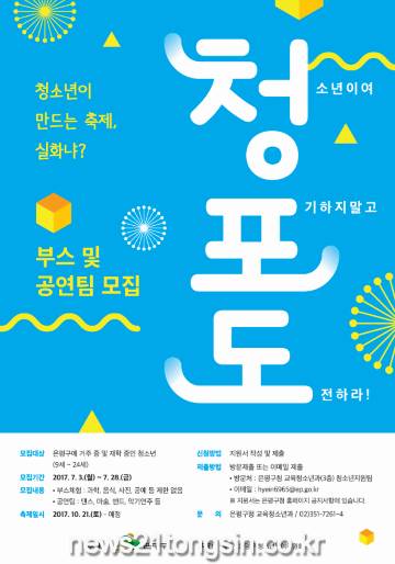 은평구(구청장 김우영)는 지역 청소년의 자발성을 신장시키고 지역의 건전한 청소년 문화를 조성하기 위해 청소년들이 직접 기획, 운영하는 축제 ‘2017. 청소년이여 포기하지 말고 도전하라!’(이하 청포도 축제)의 체험부스 운영팀 및 공연팀을 모집한다.