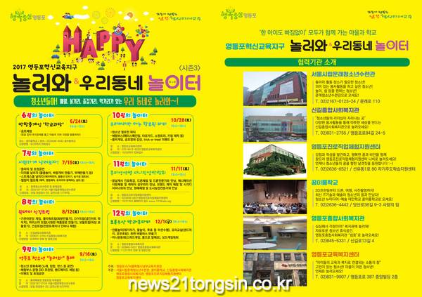 ▲7월 15일 문래청소년수련관에서 청소년 동아리공연 및 시원하게 여름을 날려줄 다채로운 체험부스 운영 ▲8월 12일 신길종합사회복지관에서 DIY, 바리스타, 전문트레이너 인바디 체험 등 ▲10월 28일 영등포교육복지센터에서 할로윈 파티 ▲11월 11일 영등포진로직업체험지원센터에서 꿈설계사 진로특강, 애니메이션 더빙체험 및 캐릭터 성우와의 만남 등 다양한 직업전문가를 만날 수 있는 미니직업박람회 ▲12월 1일 영등포종합사회복지관에서 전통놀이, 요리교실, 미니운동회 등의 프로그램을 진행한다.