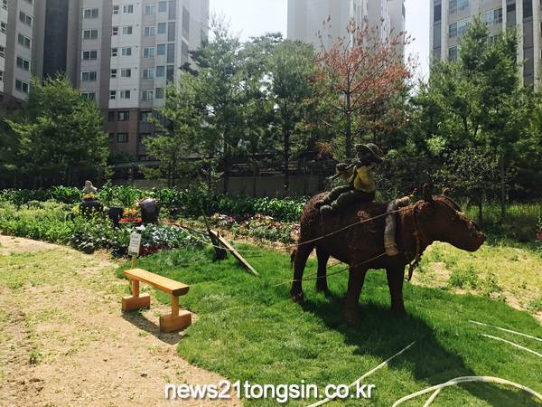 쟁기를 끄는 소, 피리 부는 목동, 풍물놀이패가 멋진 토피어리 작품으로 표현돼 농촌의 추억을 되새기게 한다.