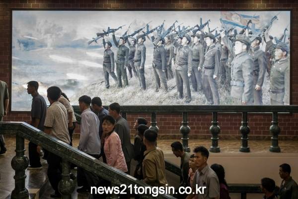 사람들이 평양 남부 신촌의 한 박물관에서 인민군 병사들을 보여주는 선전 포스터를 찾기 위해 계단을 올라가고 있다.