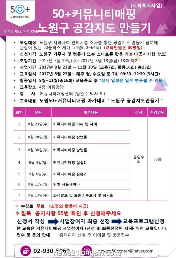 단, 고용보험 가입자는 제외된다. 신청기간은 이달 18일까지이며, 신청방법은 노원50+센터 홈페이지(http://nowon.50center.or.kr)에서 신청서 양식을 내려 받아 이메일 또는 방문접수를 하면 된다. 수강료는 무료이다.