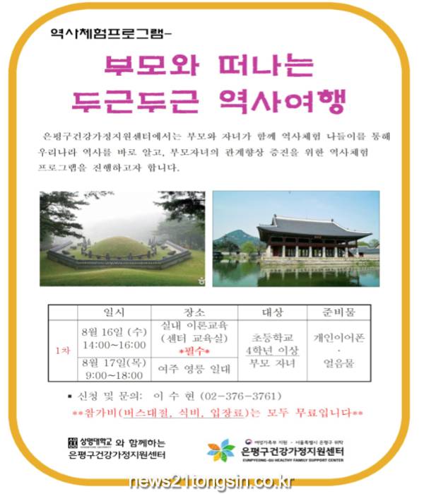 은평구(구청장 김우영) 건강가정지원센터는 부모와 자녀가 함께하는 역사체험 프로그램 “부모와 떠나는 두근두근 역사여행” 신청자를 모집한다.
