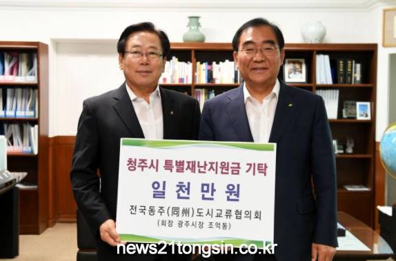 전국 동주(同州)도시 교류협의회(회장 조억동 광주시장)는 14일 청주시를 방문, 집중호우로 수해 피해를 입은 지역을 돕는데 사용해 달라며 협의회 특별재난지원금 1천만원을 청주시에 기탁했다.