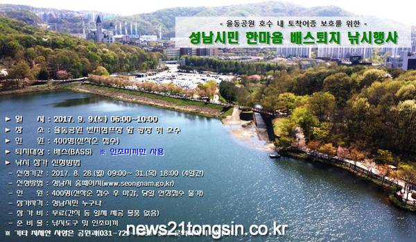 성남시(시장 이재명)는 오는 9월 9일 분당구 율동공원 호수에서 ‘성남시민 한마음 배스 퇴치 낚시 행사’를 연다.