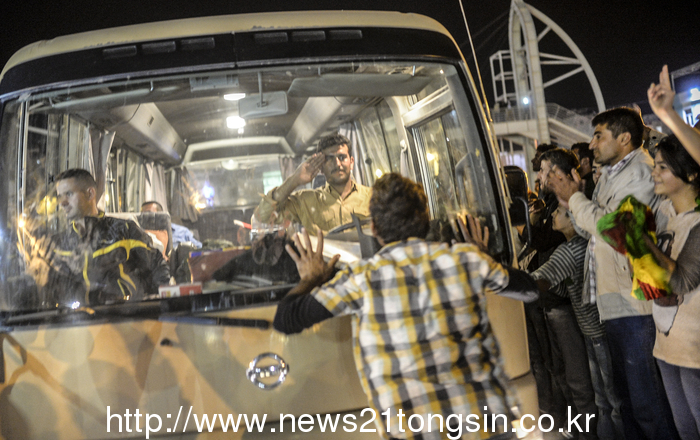 단단히 무장한 쿠르드 페쉬메르가 전사들이 IS로 부터 공격받고 있는 시리아 국경의 코바니(Kobane)마을 수비에 동참하기 위해 육상과 항공편으로 왔다.