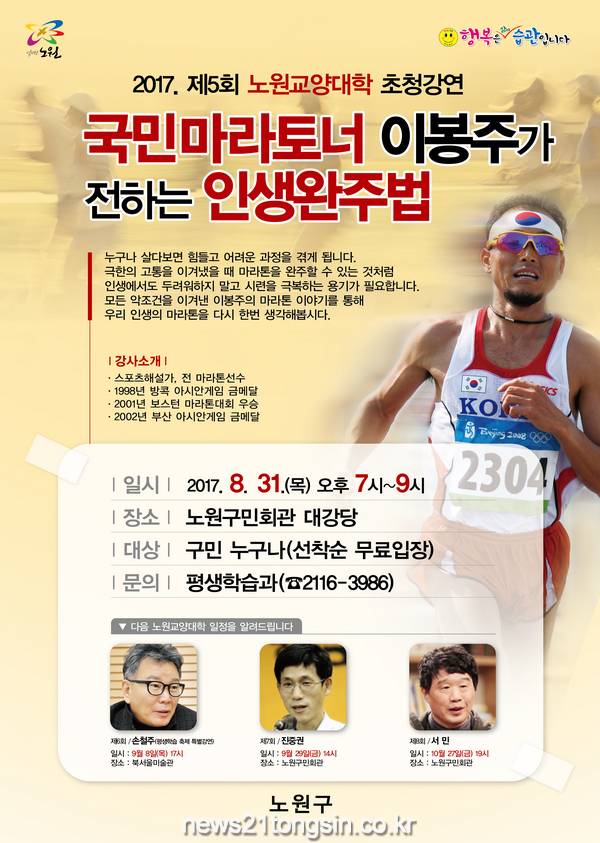 서울 노원구(구청장 김성환)는 31일 오후 7시 노원구민회관 대강당에서 열리는 노원교양대학에서 국민마라토너 이봉주 씨가 ‘인생완주법’에 대해 강연을 한다고 30일 밝혔다.