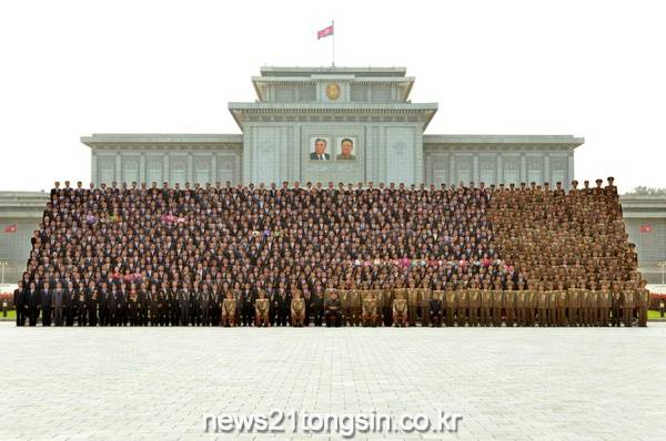 대륙간탄도미사일(ICBM)급 ‘화성-14형’ 미사일 시험발사 성공에 참여한 관계자들과 금수산태양궁전에서 기념사진을 찍은 김정은 북한 노동당 위원장