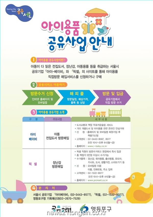 아이용품 공유사업은 0~13세 어린이들이 성장해서 더 이상 쓰지 않는 아동전집이나 장난감 등 아이용품을 서울시 지정 아이용품 공유기업에 제공하고 필요한 물품이 있을 경우 저렴하게 구매하는 것이다.