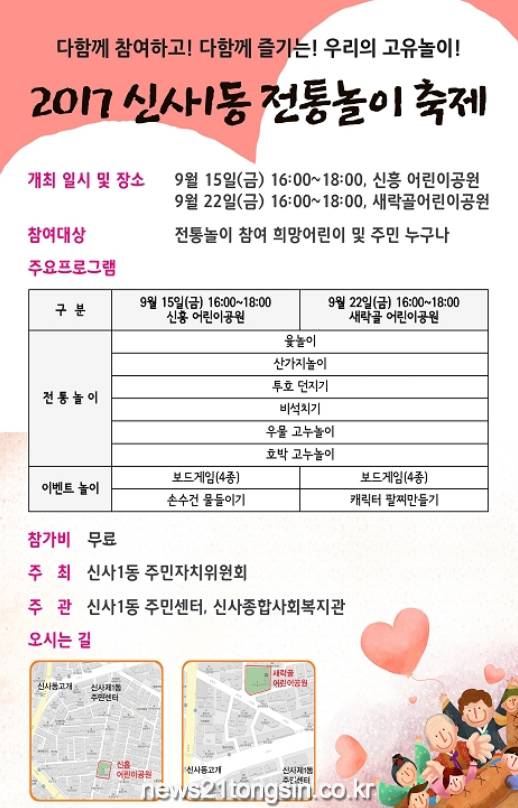 전통놀이 축제는 신사종합사회복지관과 연계 추진하는 행사로 윷놀이, 산가지놀이, 투호던지기 등 전통놀이 6종과 이벤트 놀이로 보드게임과 손수건 물들이기, 캐릭터 팔찌 만들기 등 다양한 놀이를 진행할 예정이다.