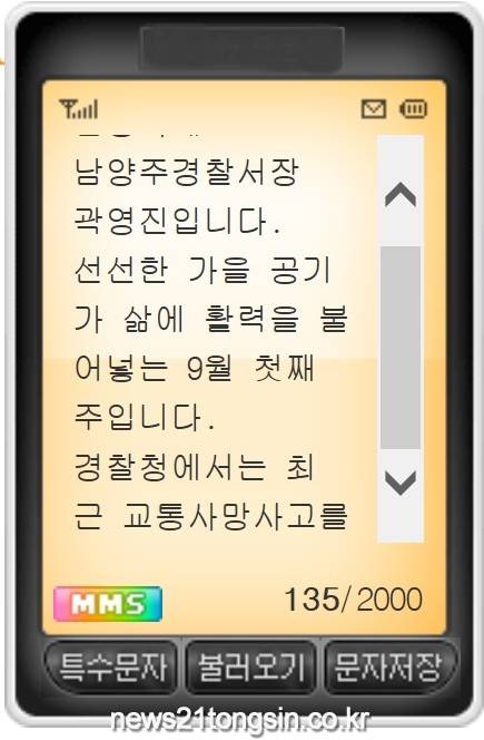 남양주경찰서는 14일 지역주민들에게 범죄예방과 주민안전을 위한 치안정보제공을 통해 경찰업무에대한관심도와 치안만족도를 향상시키기 위해 매주 "안심드림 문자발송 서비스"를 시행할 계획이라고 밝혔다.