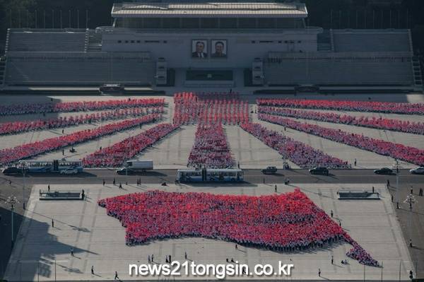 북한 평양 김일성 광장에서 축하 행사에 앞서 리허설을 하고 있는 모습.