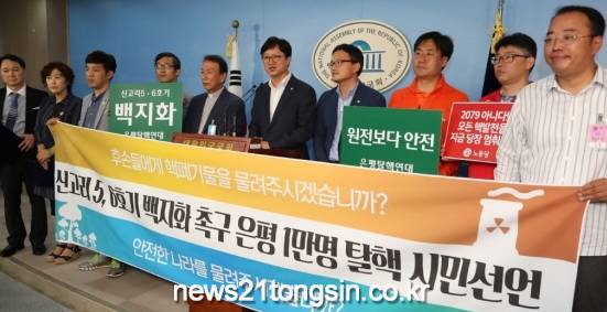 27일 오후 서울 여의도 국회 정론관에서 더불어민주당 박주민(왼쪽 다섯번째) 은평갑 지역위원장, 강병원(왼쪽 여섯번째) 은평을 지역위원장을 비롯한 은평탈핵연대가 기자회견을 열고 신고리 5,6호기 건설 백지화, 신규 원전계획 전면 중단 요구, 핵발전소를 안전하고 깨끗한 재생에너지로 전환할 것을 요구하고 있다.
