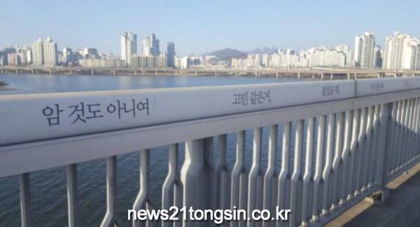서울시는 잇따르는 한강 자살 시도를 막기 위해 마포대교를 중심으로 다양한 행정을 펼치고 있다. 지난 2011년 7월 마포대교와 한남대교에 설치된 자살 방지 상담용 ‘SOS 생명의 전화’는 현재까지 16개 다리에서 64대를 운영 중이고, 2013년 마포대교와 서강대교를 시작으로 4개 다리에서 ‘CCTV 영상감시 출동 시스템’도 가동 중이다. CCTV에 자살 시도자가 감지되면 즉시 119 구조대가 출동하도록 했다. 2012년 마포대교 양측 보도 난간 1.8km 구간엔 자살 시도자의 마음을 돌리기 위한 ‘희망의 메시지’를 설치하기도 했지만 여전히 자살 시도가 빈발하고 있다.