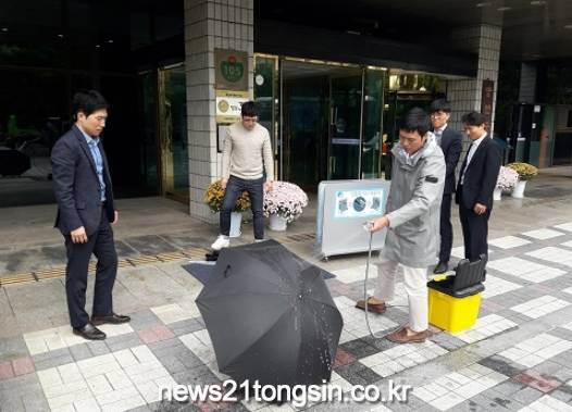 청사 입구에 놓일 ‘친환경 우산빗물 제거기’는 양쪽에 달린 흡수패드가 우산을 좌우로 털어 빗물을 제거하는 방식이다.