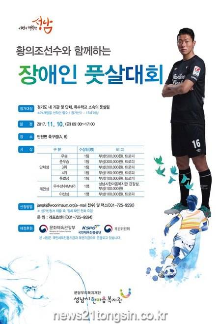 성남시 한마음복지관(관장 이정주)은 11월 10일 오전 9시 탄천변 축구장에서 ‘황의조 선수와 함께하는 장애인 풋살대회(이하 풋살대회)’를 개최한다고 밝혔다.