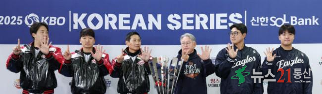 트윈스 감독과 김경문 한화 이글스 감독을 비롯한 선수들이 25일 서울 잠실야구장에서 열린 2025 KBO 한국시리즈 미디어데이에서 우승 트로피와 기념촬영을 하던 중 손가락으로 몇 차전 경기까지 갈 것인지 표시하고 있다. 왼쪽부터 LG 트윈스 임찬규, 박해민, 염 감독, 한화 이글스 김 감독, 채은성, 정우주 [뉴스21 통신=추현욱 ] LG트윈스와 한..