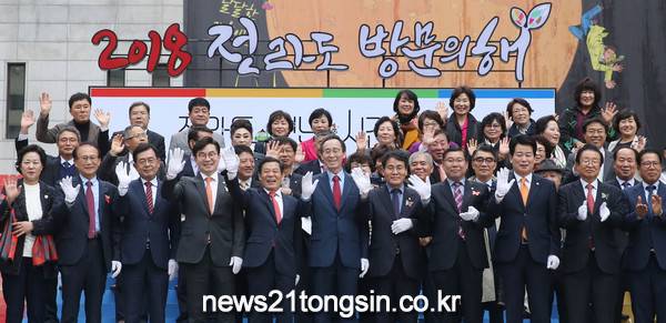 ▲ 2018년 전라도 방문의 해전라남도와 광주시, 전라북도는 10일 서울 더플라자호텔에서 시도지사와 정세균 국회의장을 비롯한 국회의원, 출향인사, 여행업계, 지자체 공무원 등 600여 명이 참석한 가운데 ‘2018 전라도 방문의 해’ 선포식을 개최했다.