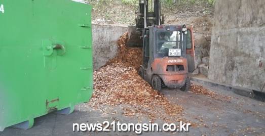 이렇게 이물질까지 제거한 낙엽이 일정부분 모이게 되면 청소차량을 이용해 친환경농장에 직접 무상으로 제공한다.