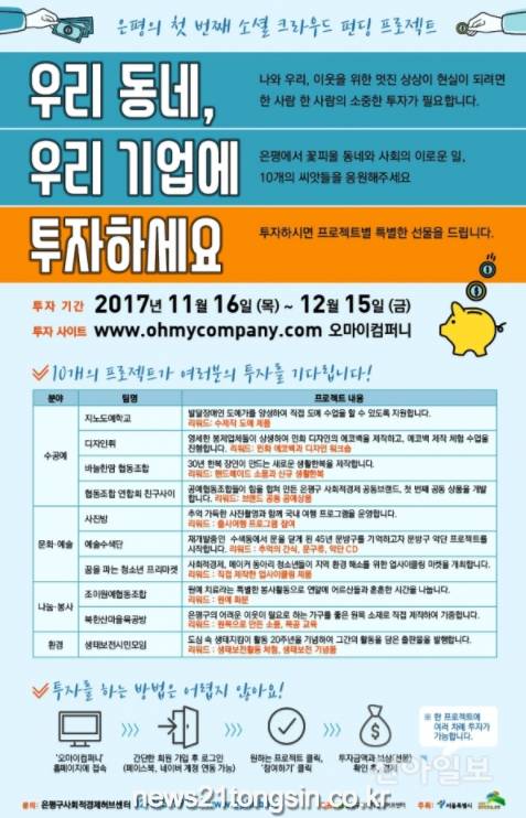 서울 은평구는 지난 16일부터 오는 12월 15일까지 사회적경제허브센터에서 첫 번째 소셜 크라우드 펀딩을 시작했다고 20일 밝혔다.