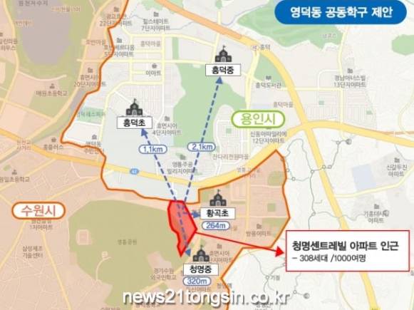 용인시는 기흥구 영덕동 청명센트레빌 아파트 입주자들의 자녀를 위해 용인- 수원시의 경계지역에 위치한 수원 황곡초등학교와 용인 흥덕초등학교를 공동학구로 지정해 가까운 거리에 있는 학교를 배정받을 수 있도록 수원교육지원청에 요청하기로 했다고 23일 밝혔다.