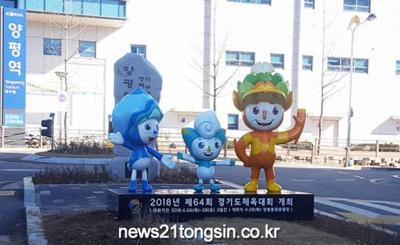 양평군은 내년 개최예정인 ‘제64회 경기도체육대회’와 ‘제8회 경기도장애인체육대회’의 송공적 개최를 위해 대회 마스코트를 양평역(경의중앙선) 앞에 설치했다.