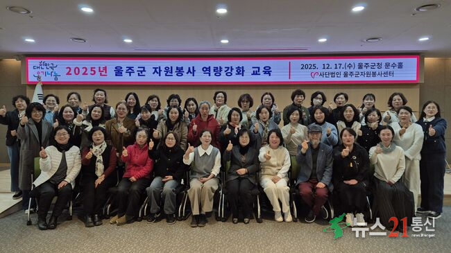 (사)울주군자원봉사센터(센터장 손영순)가 17일 군청 문수홀에서 울주군 자원봉사 전문교육강사단과 자원봉사단체 리더 등 40여명이 참석한 가운데 ‘2025 자원봉사자 역량강화 교육’을 개최했다.이번 교육은 ‘변화 속의 봉사, 함께 가치를 나누다’을 주제로 자원봉사자의 전문성을 높이고, 지속적인 활동 속에서 누적된 피로...
