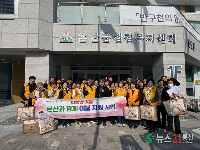 ▲사진제공:울주군청 울주군 온산읍 지역사회보장협의체(공동위원장 이준호, 박광철)가 17일 온산읍 저소득 취약계층 14세대를 대상으로 겨울이불 세트를 지원하는 나눔사업을 실시했다.이번 사업은 S-OIL 지정기탁금 250만 원을 활용해 겨울철 한파에 취약한 이웃들의 건강한 겨울나기를 돕기 위해 따뜻한 겨울이불 세트를 지원했다.지원 대.