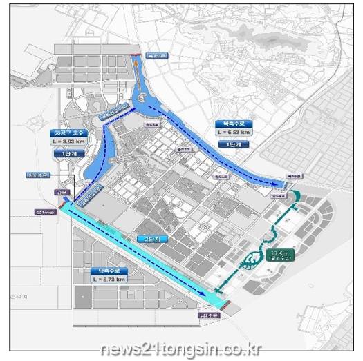 'ㄷ'자 형태 호수와 수로 중에서도 1단계로는 서쪽 호수와 북측 수로를 먼저 연결할 방침이다.
