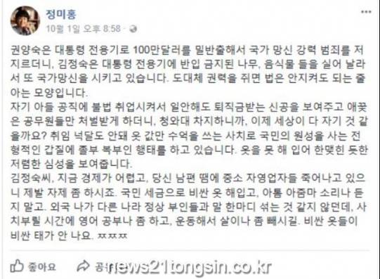 정 전 아나운서는 지난해 10월1일 자신의 페이스북에 "영부인이 취임 넉 달도 안돼 옷값만 수억을 쓰는 사치로 국민 원성을 사는 전형적인 갑질에 졸부 복부인 형태를 하고 있다"는 게시글을 올렸다.