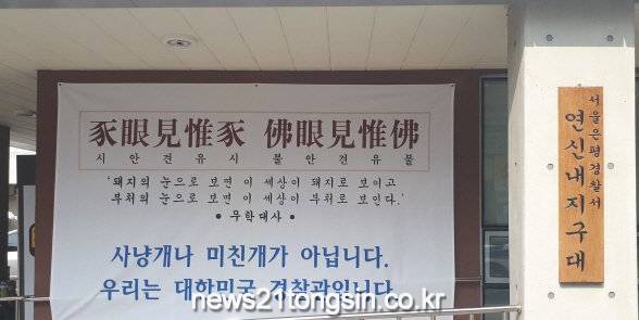 연신내지구대는 지난 23일 오후 3시쯤 지구대 입구 왼쪽 외벽에 가로 3m, 세로 2m 크기의 플래카드를 설치했다. 흰 바탕의 플래카드에는 ‘시안견유시 불안견유불(豕眼見惟豕 佛眼見惟佛). 사냥개나 미친개가 아닙니다. 우리는 대한민국 경찰관입니다’라는 문구가 적혀 있다.