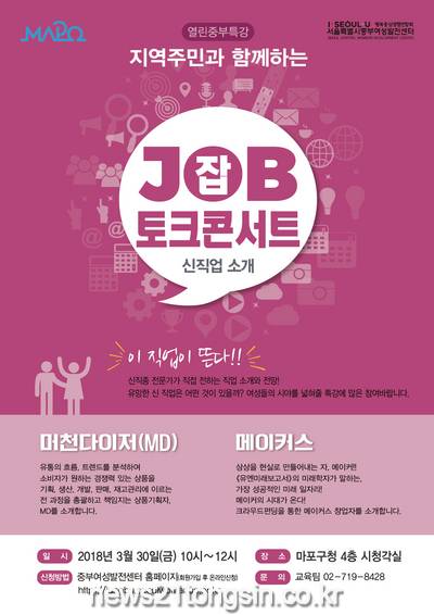 오는 30일(금), 2018년 첫 번째 마포구 “JOB 토크 콘서트”가 열린다. 지속되는 취업난에 마포구(구청장 박홍섭)는 작년에 이어 올해도 중부여성발전센터와 공동으로 콘서트를 개최한다고 밝혔다.