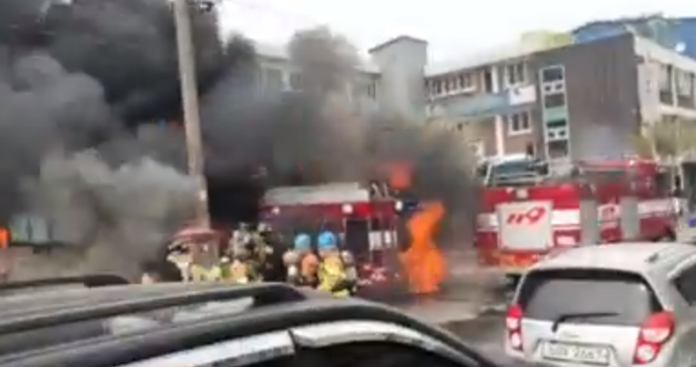 진화 과정에서 현장에 접근하던 소방 펌프차 1대에도 불이 옮겨 붙었고 '펑'하는 폭발음과 함께 차량이 전소했다.