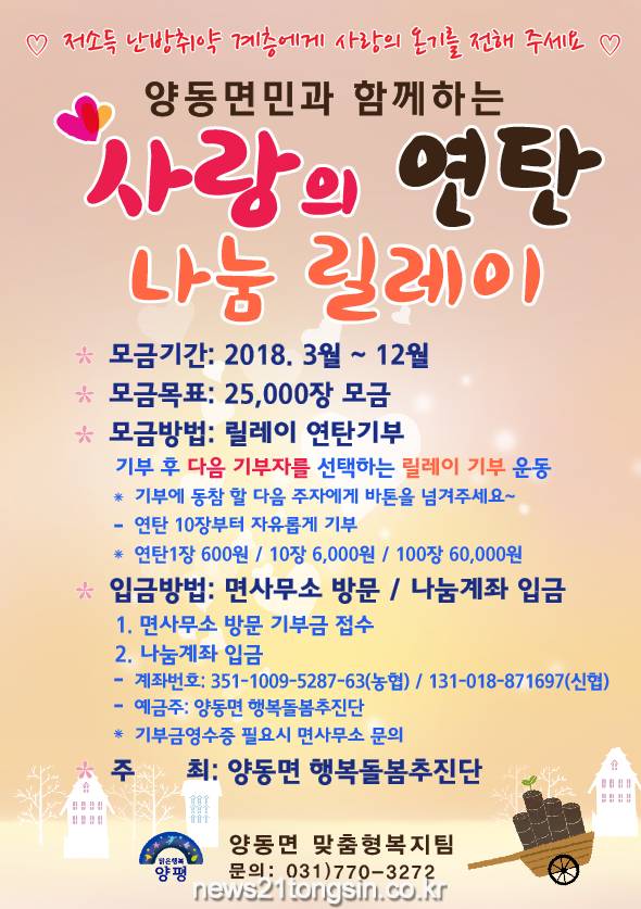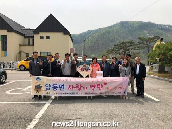 지난 4월 26일 양동면행복돌봄추진단에서는 지역주민이 다함께 참여하는 연탄기부 릴레이 모금활동을 추진하여 관내 저소득 난방취약 계층이 따뜻한 겨울을 보낼 수 있도록 지역사회 내 나눔 문화를 활성화하고자하는 취지에 발대식을 가졌다.