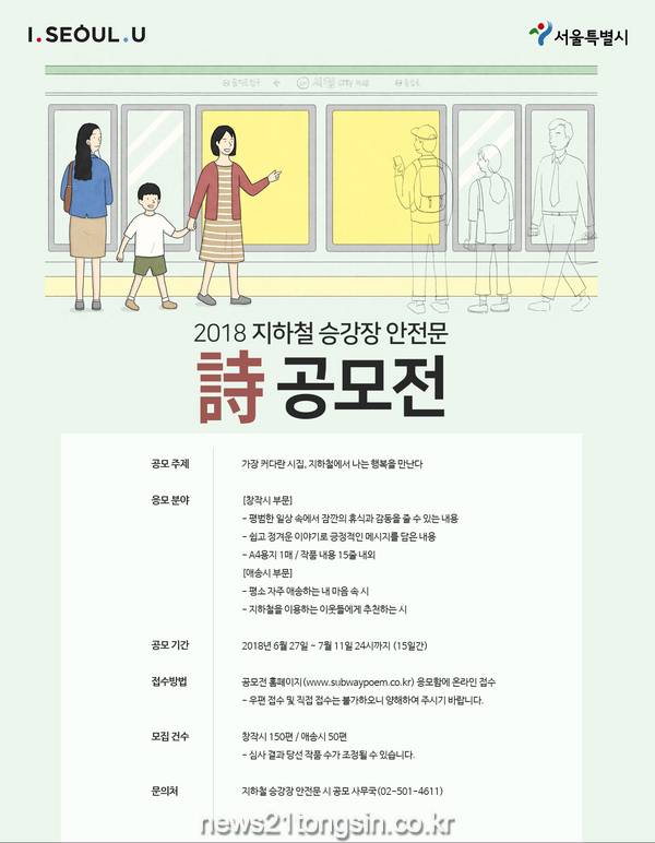 (뉴스21통신/서울서부취재본부)= 서울시는 6월 27일(수)~7월 11일(수), 지하철 승강장 안전문에 게시할 ‘시민 창작 시(詩)’ 작품 150편 및 지하철을 이용하는 시민들에게 추천하고 싶은 ‘애송시’ 50편(예:윤동주의 서시 등)을 공모한다고 밝혔다. 지하철을 기다리는 잠깐의 시간 동안 시민들에게 따뜻한 위로와 희망의 메시지를 건넬 총 200편의 시를 선정하여 지하철 1~9호선, 분당선 총 299개역 승강장 안전문에 게시할 계획이다.
