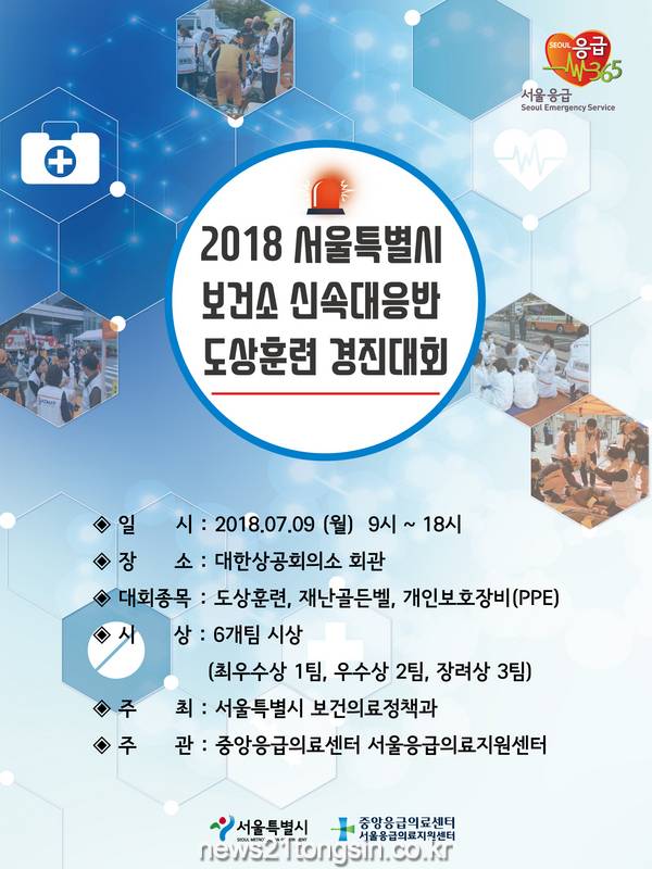 서울시가 주최하고 서울응급의료지원센터가 주관하는 ‘2018 보건소 신속대응반 도상훈련 경진대회’는 9일 9시부터 대한상공회의소 회관에서 열린다. 서울시 25개구 보건소의 ‘신속대응반’인 의사, 간호사, 약사, 지원요원 등 약 150여명이 참가할 예정이다.