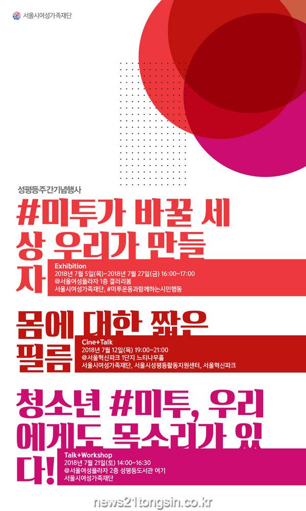 (뉴스21통신/서울서부취재본부)= 서울시여성가족재단(대표이사 강경희)은 서울시 성평등주간(7.1.~7.7.)을 기념해 7월 한 달 간 성평등을 주제로 한 강연·워크숍, 상영, 전시를 개최한다.