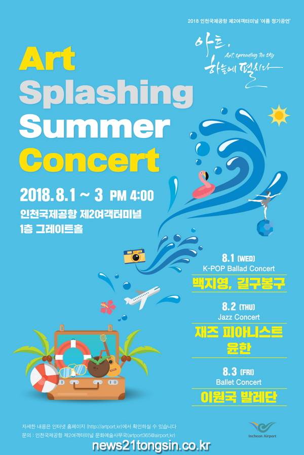 ‘Art Splashing Summer Concert’라는 주제로 열리는 이번 여름 정기공연은 K-POP 가수, 피아니스트, 발레단 등 다양한 장르의 예술인이 참여해 휴가철 인천공항을 찾은 국내외 여행객과 상주직원, 방문객에게 감동의 무대를 선보일 예정이다.