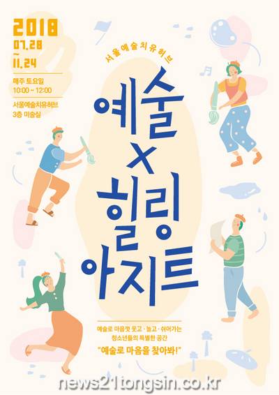 ▲ 서울예술치유허브 예술X힐링 아지트 포스터서울문화재단(대표이사 직무대행 서정협) 서울예술치유허브는 8월 4일부터 11월 24일까지 매주 토요일마다 청소년 대상 예술체험과 힐링이 함께하는 <예술×힐링 아지트>를 운영한다. 매주 토요일 오전 10시~12시에 운영하며 11세부터 19세의 청소년이라면 사전신청 없이 누구나 참여할 수 있다.