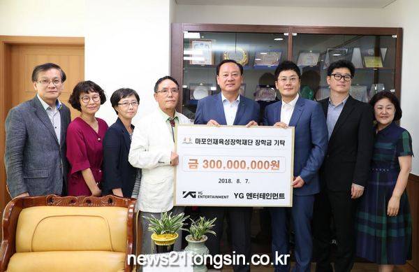 마포구 합정동에 본사가 있는 YG엔터테인먼트는 이날 마포구의 인재 육성을 위한 장학금으로 3억원을 기탁했다.