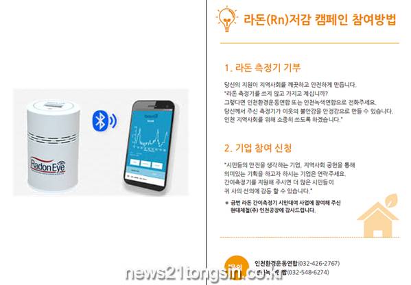 인천시(시장 박남춘)가 환경단체, 기업과 함께 시민들의 라돈(Rn) 불안 해소를 위해 라돈 간이측정기 대여와 시민인식 개선을 내용으로 ‘실내공기 라돈(Rn) 저감 캠페인’을 실시한다.