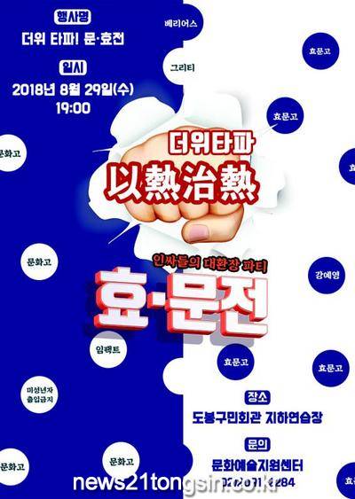 도봉구(구청장 이동진)가 문화예술지원센터 주관으로 매달 마지막 주 수요일 저녁 진행하고 있는 ‘지역예술인의 밤’이 그 5번째 행사로 오는 8월 29일 ‘더위타파! 효 문전’이 개최된다.
