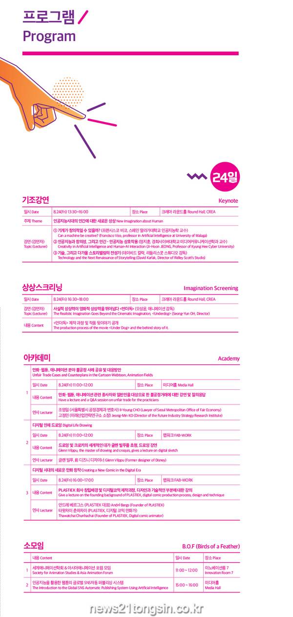 (뉴스21통신/서울서부취재본부)= 서울시는 인공지능 시대에 상상산업의 현재와 미래를 보여줄 ‘서울상상산업포럼’은 8월 24일(금)~25일(토) 양일간, DDP(동대문디자인플라자)디자인 나눔관과 크레아에서 개최한다고 밝혔다. ‘인공지능시대의 인간에 대한 새로운 상상’을 주제로 점점 더 인간을 닮아가는 인공지능과 인간이 맞이하게 될 미래를 상상해보는 시간을 갖는다.