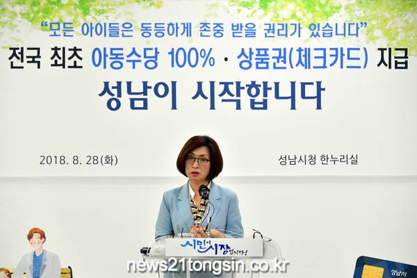 은 시장은 28일 오전 10시 30분 시청 한누리에서 기자회견을 열고 “성남시는 차별 없는 복지라는 기존 취지를 실현하기 위해 만 6세 미만의 모든 아이에게 아동수당을 지급할 것”이라면서 “정부 방침보다 1만원을 더 보태 성남지역 대상 아동 4만3천여 명 가정에 11만원을 지급할 계획”이라고 말했다.