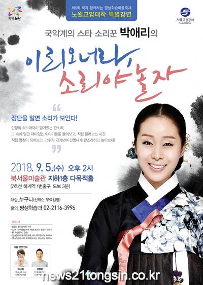 서울 노원구(구청장 오승록)는 5일 오후 2시 서울시립 북서울미술관에서 국악인 박애리씨를 초청하여 ‘이리오너라~ 소리야놀자!’라는 주제로 노원교양대학을 개최한다고 밝혔다.